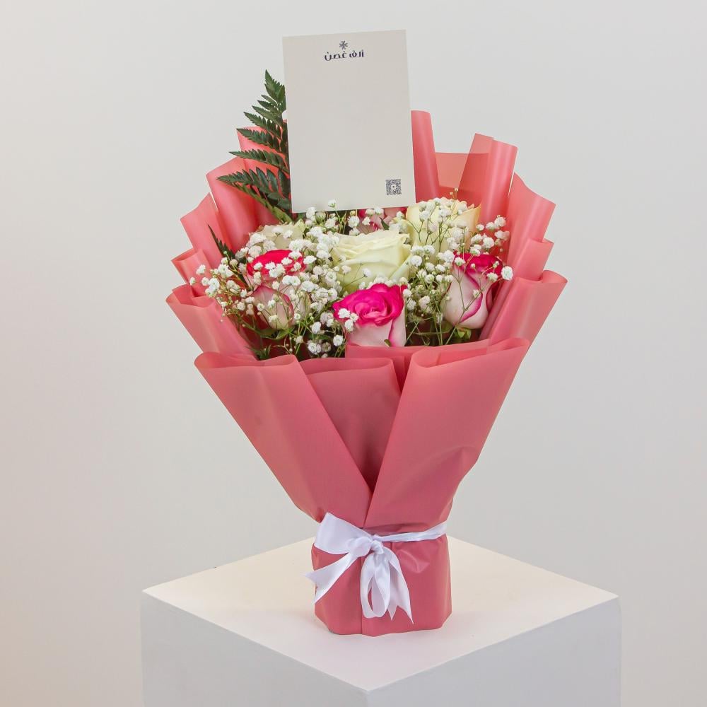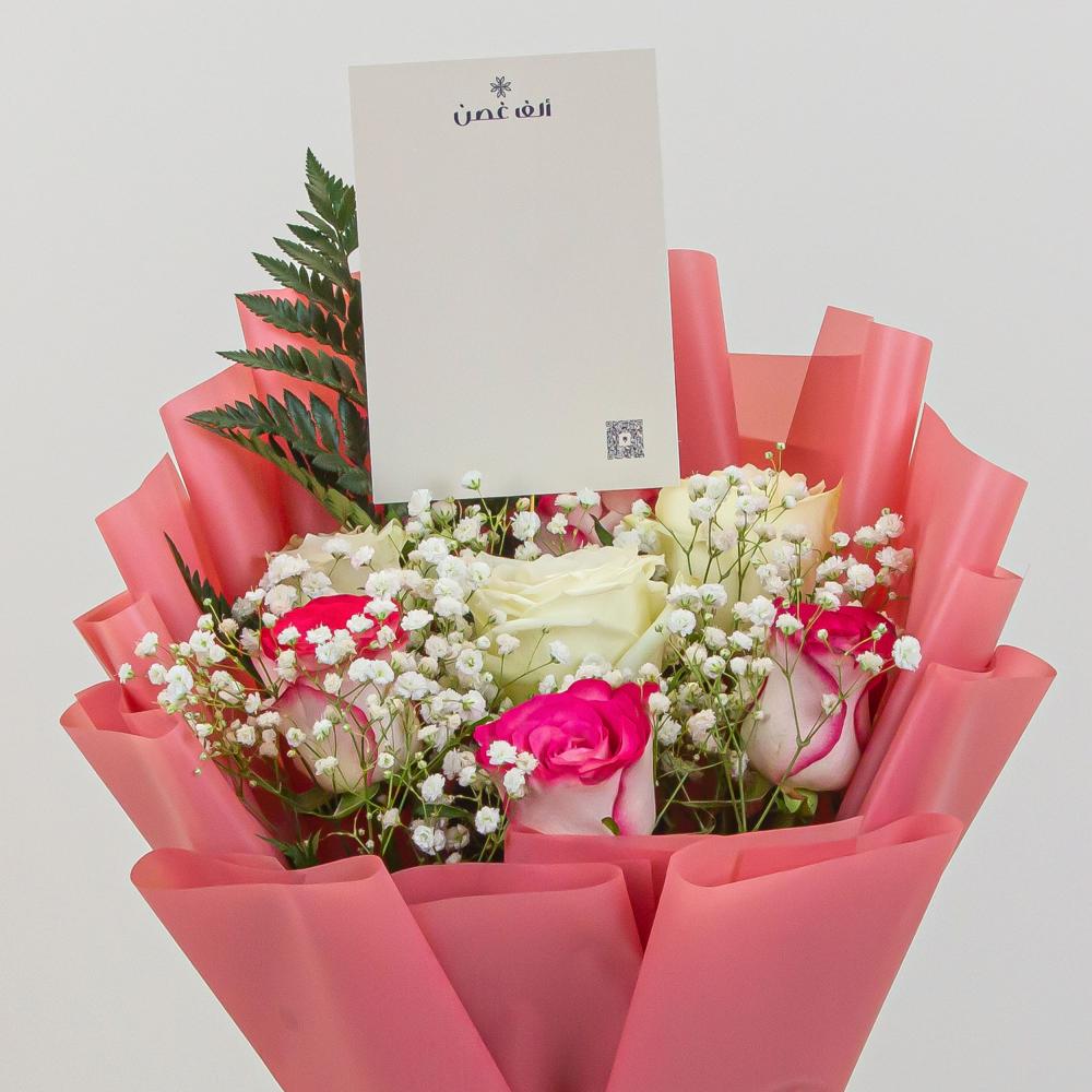 تتميز هذه الباقة بتنسيق أنيق من الورود البيضاء والوردية، مع لمسة من زهور الجيبسوفيلا الناعمة التي تمنحها طابعًا مميزًا وحالمًا