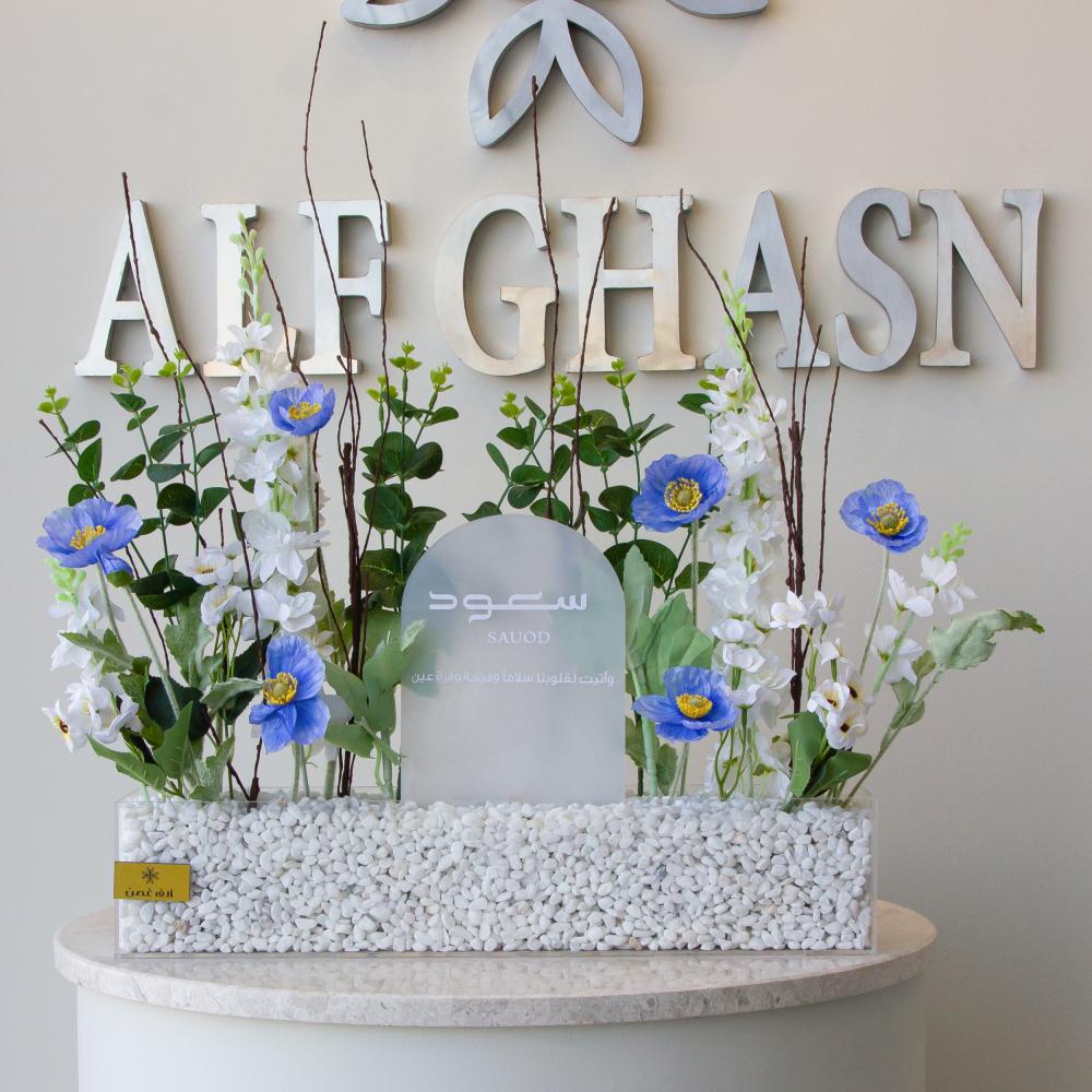 تنسيق أكريلك فخم يجمع بين الزهور البيضاء والزرقاء بتصميم متناغم يبعث على الهدوء والرقي